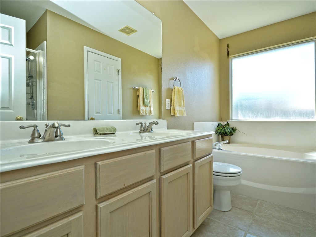 Beautiful 1-story in great neighborhood! All hard tile & laminate floors; spacious family room w/gas fireplace; large kitchen w/corain counters, tons of cabinets & bay window; master bath w/ double vanities, separate shower, garden tub, & walk-in closet; great community amenities.